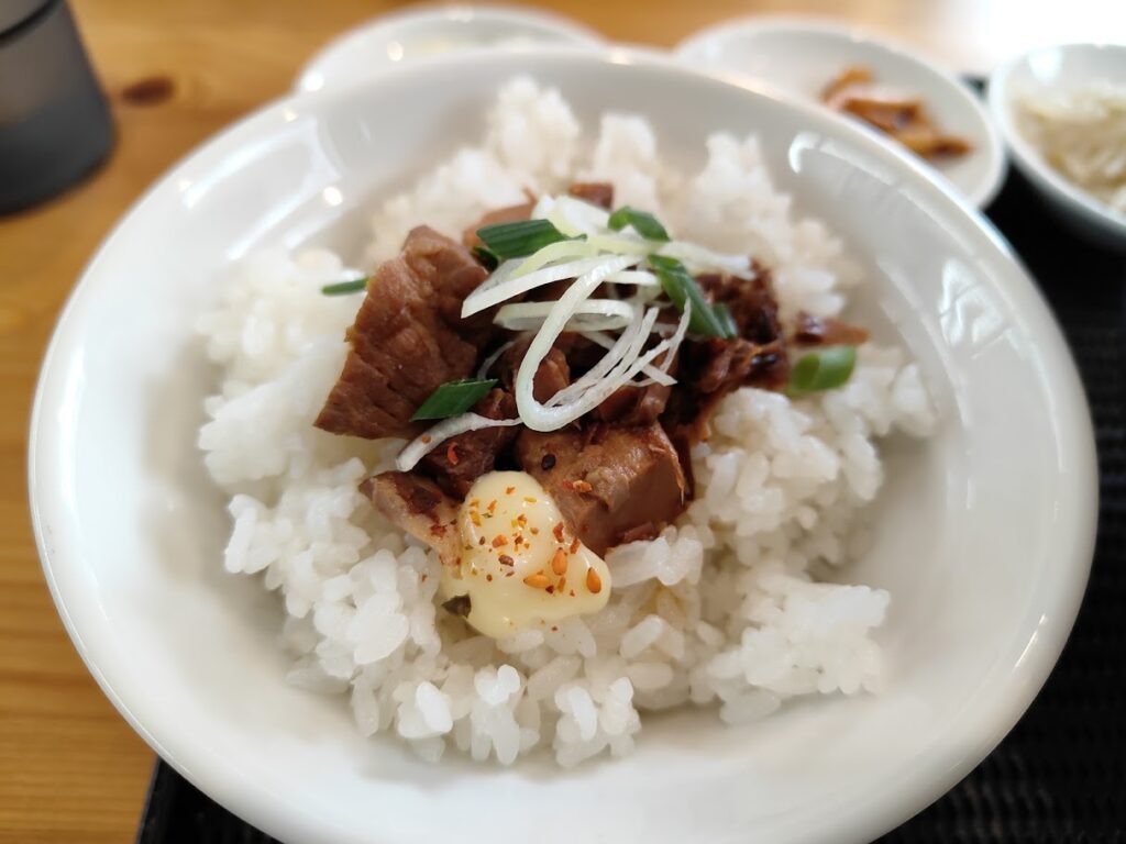 単に切り方を変えたものなのか、もしかすると味付けの違うチャーシューなのかはわかりませんでしたが、ご飯にあう歯ごたえのあるチャーシューでした。